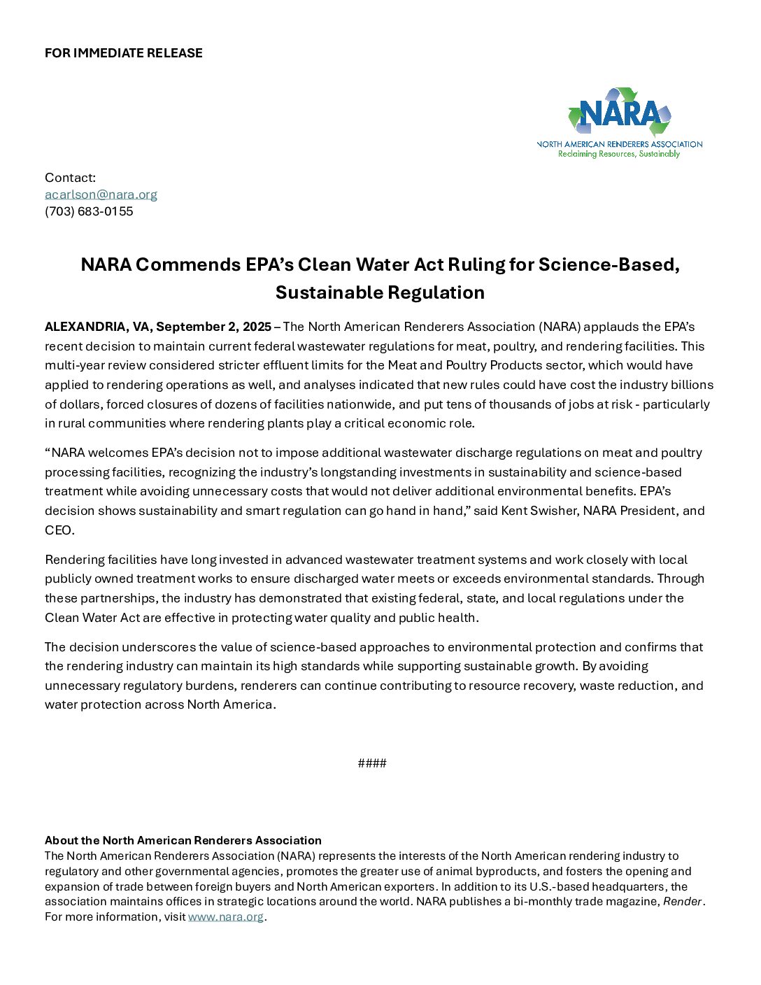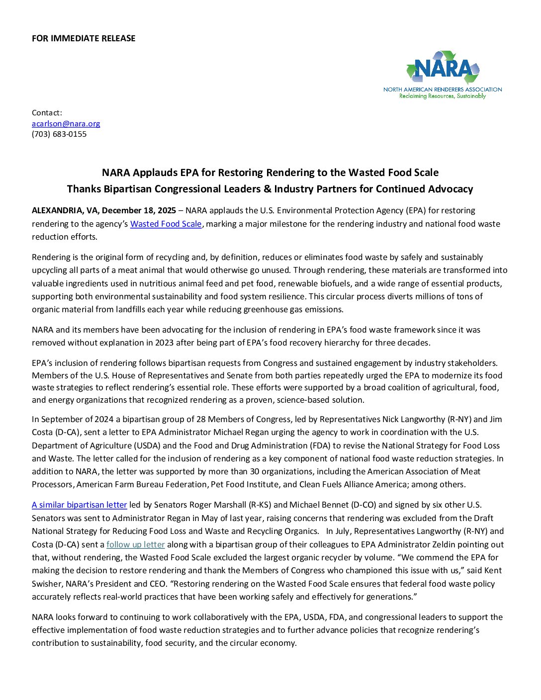 PRESS RELEASE: (9/20/2024) NARA Commends Bipartisan Leadership for Championing Rendering inclusion in EPA Food Waste Strategies