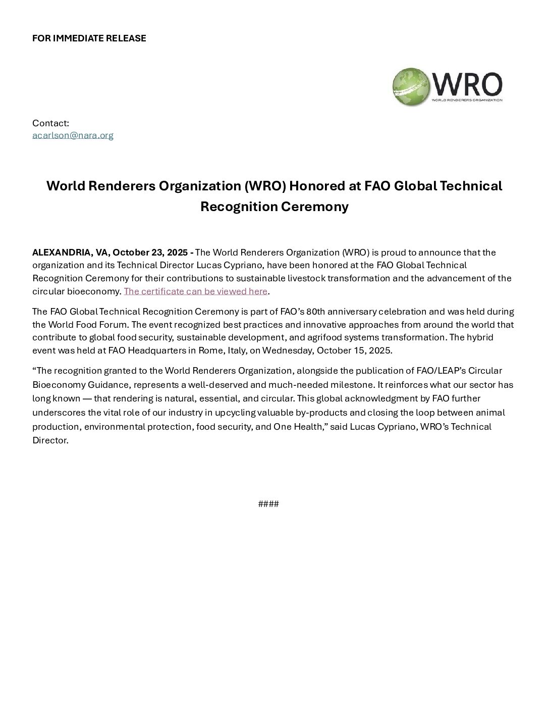 PRESS RELEASE: (10/23/2025) WRO Honored at FAO Global Technical Recognition Ceremony