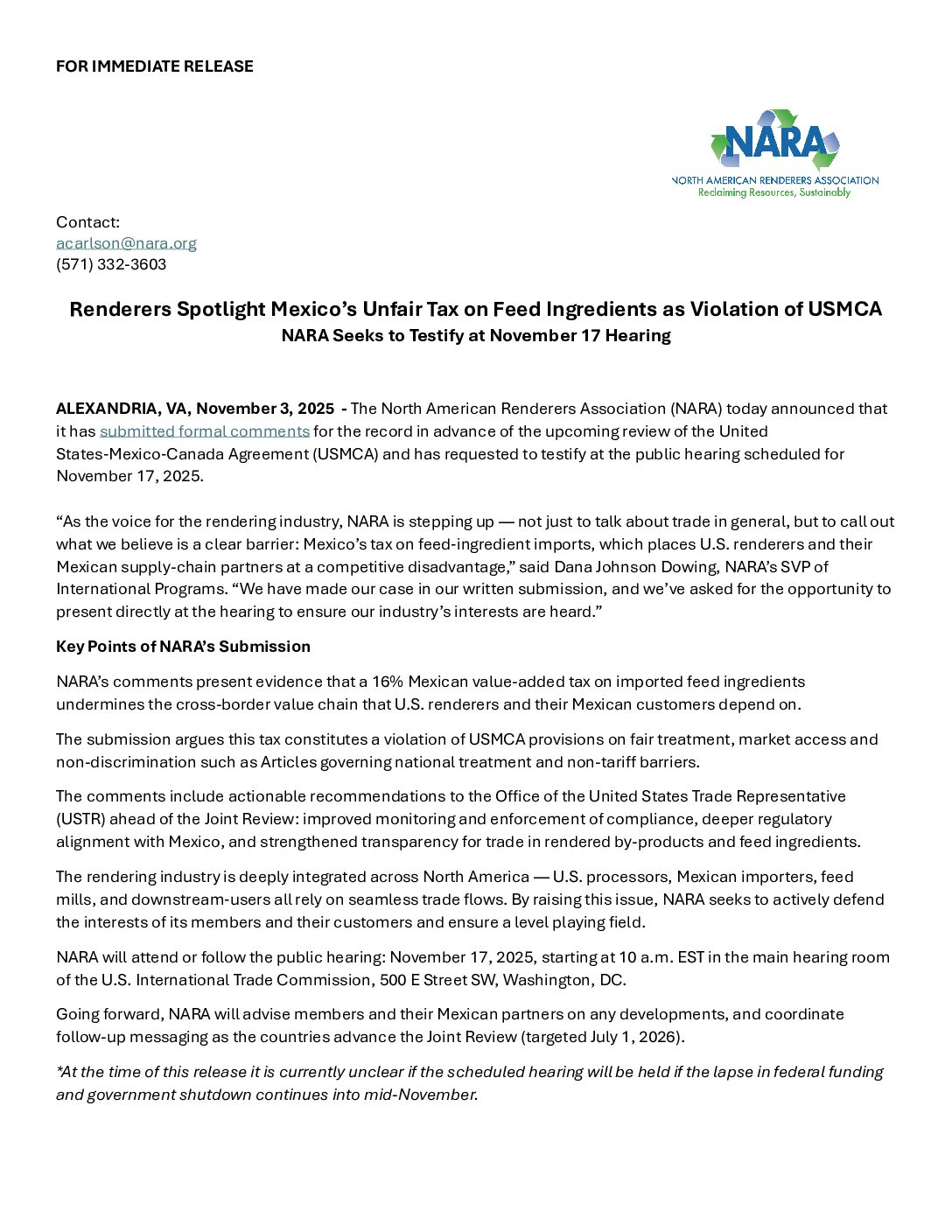 PRESS RELEASE: (11/3/2025) Renderers Spotlight Mexico’s Unfair Tax on Feed Ingredients as USMCA Violation