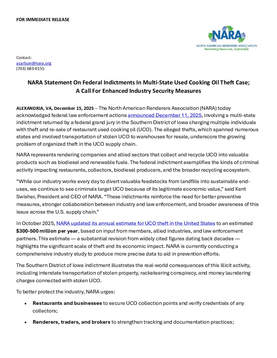 PRESS RELEASE: (12/15/2025) NARA Statement On Federal Indictments In Multi-State Used Cooking Oil Theft Case