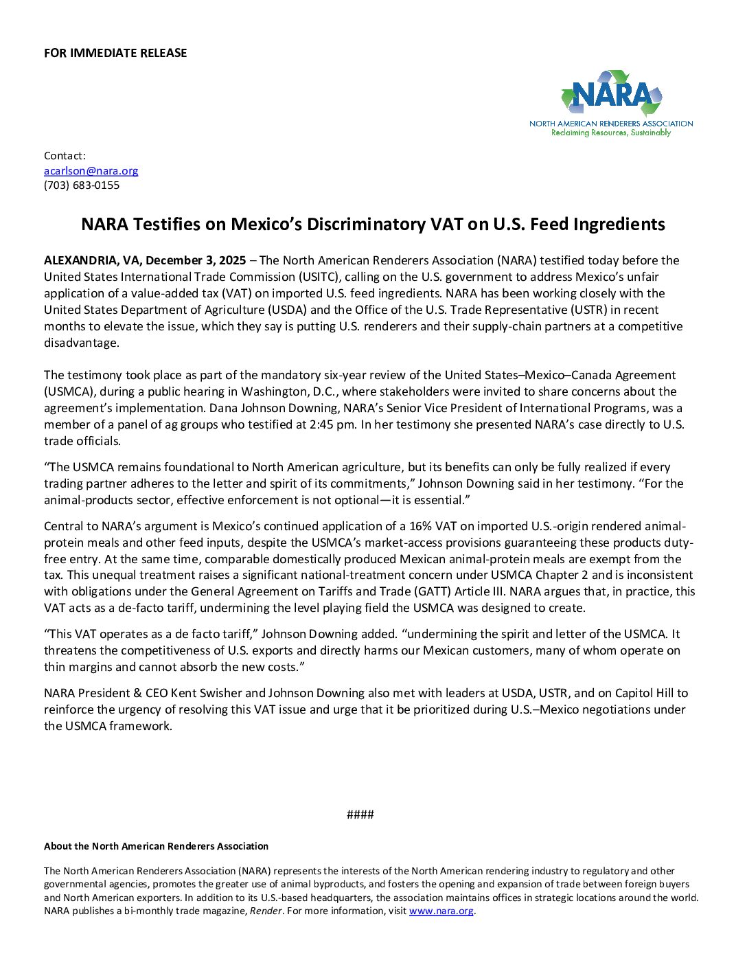 PRESS RELEASE: (12/3/2025) NARA Testifies on Mexico’s Discriminatory VAT on U.S. Feed Ingredients